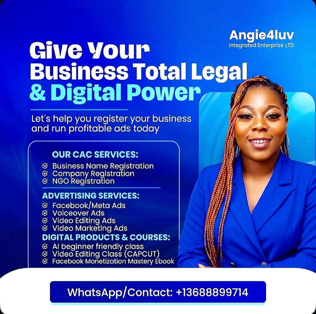 Angie4luv Integrated Enterprise LTD helps entrepreneurs register CAC businesses and NGOs, then supports growth with beginner friendly AI tools, CapCut video editing, Facebook monetization tips, Meta ads, Content creation, Data entry, and AI powered website design tailored to Nigerian founders